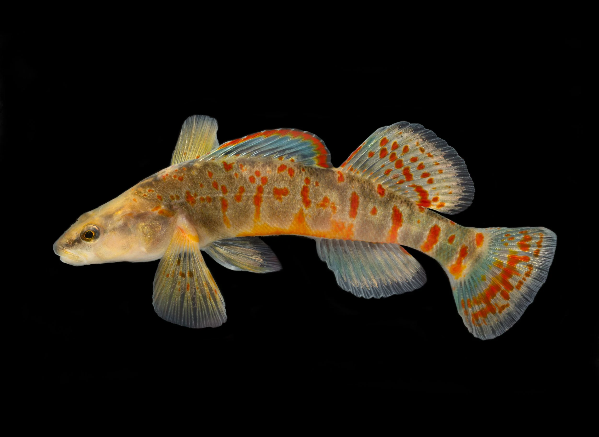 At just under five inches long, the Cumberland Arrow Darter is one of the larger darters. Its slender body, long snout, and large mouth give it an almost arrow-like appearance. Normally, its coloring blends beautifully with the streambed—soft straw yellow or pale green, marked by gentle saddles and bold side blotches that sometimes resemble letters like W or V. During spawning season, though, males become impossible to miss, glowing blue-green with fiery red and orange accents along their bodies and fins. Females stay much more understated, their muted tones helping them stay hidden and safe.